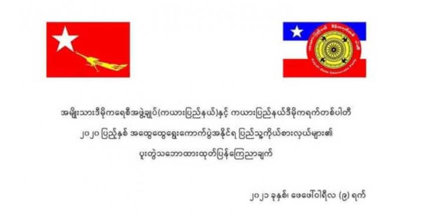 ၂၀၂၀ ရွေးကောက်ပွဲမှာ အနိုင်ရထားတဲ့ ကယားပြည်နယ် ဒီမိုကရက်တစ်ပါတီ (KYSDP) နဲ့ အမျိုးသားဒီမိုကရေစီအဖွဲ့ချုပ်ပါတီ (NLD)က ကိုယ်စားလှယ်တချို့ဟာ ဒီကနေ့ (ဖေဖော်ဝါရီလ ၄ရက်နေ့ ) မှာ ဆန္ဒထုတ်ဖော်တဲ့ ပြည်သူတွေညီညွှတ်ကြဖို့အတွက်ကိုရည်ရွယ်ပြီး အချက်(၄)ပါတဲ့ ထုတ်ပြန်ချက်တစ်ဆောင်ကို ပူးတွဲ ထုတ်ပြန်ခဲ့ပါတယ်။