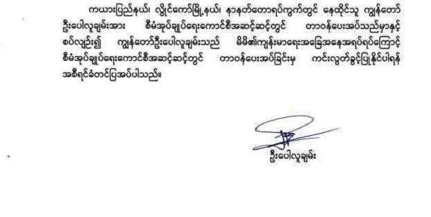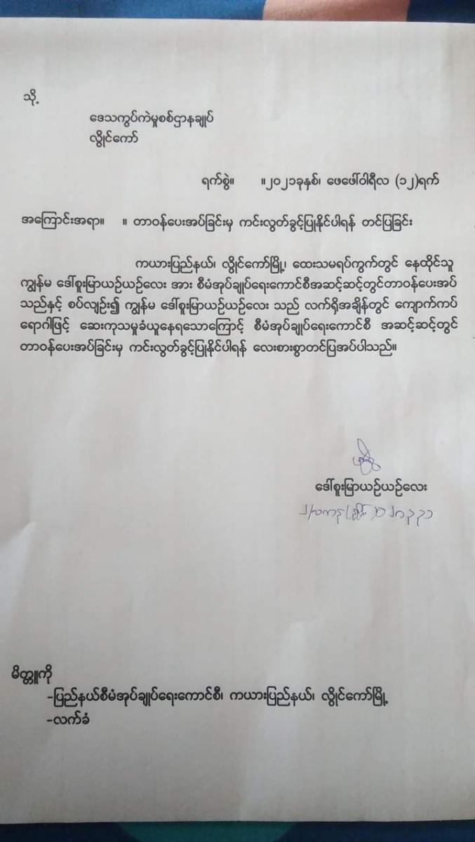အဆိုပါ တာဝန်များကို ၎င်းတို့နှစ်ဦးသည် ကျန်းမာရေးအခြေအနေအကြောင်းပြ၍ ငြင်းဆိုခဲ့ခြင်းဖြစ်ပြီး  စီမံအုပ်ချုပ်ရေးကောင်စီအဆင့်ဆင့်တွင် တာဝန်ပေးအပ်ခြင်းမှ ကင်းလွတ်ခွင့်ပြုရန် ဖေဖော်ဝါရီ ၁၂ရက်တွင် ကယားပြည်နယ် လွိုင်ကော်ရှိ ဒေသကွပ်ကဲမှုစစ်ဌာနချုပ် ကို တင်ပြထားခဲ့ကြောင်း သိရသည်။