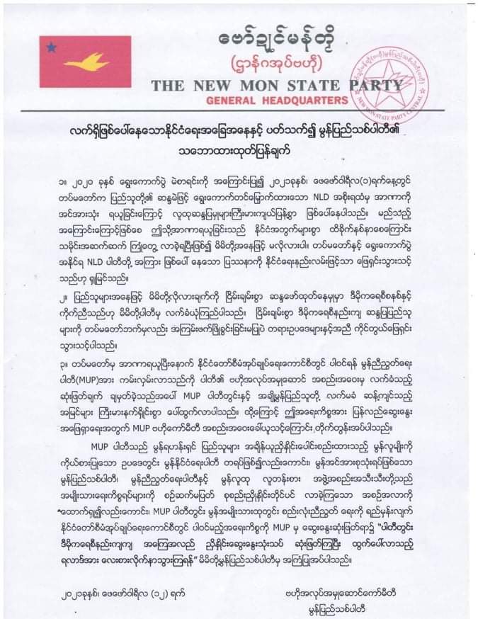 တပ်နှင့် ရွေးကောက်ပွဲအနိုင်ရ NLD ပါတီတို့အကြား ဖြစ်ပေါ်နေသောနေသော ပြဿနာကို နိုင်ငံရေးနည်းလမ်း ဖြင့်သာ ဖြေရှင်းသင့်ပါကြောင်း လက်ရှိဖြစ်ပေါ်နေသော နိုင်ငံရေးအခြေအနေနှင့် ပတ်သက်၍ မွန်ပြည်သစ်ပါတီ NMSP ယမန်နေ့ ဖေဖော်ဝါရီ ၁၂  ရက်စွဲဖြင့် သဘောထား ထုတ်ပြန်လိုက်သည်။