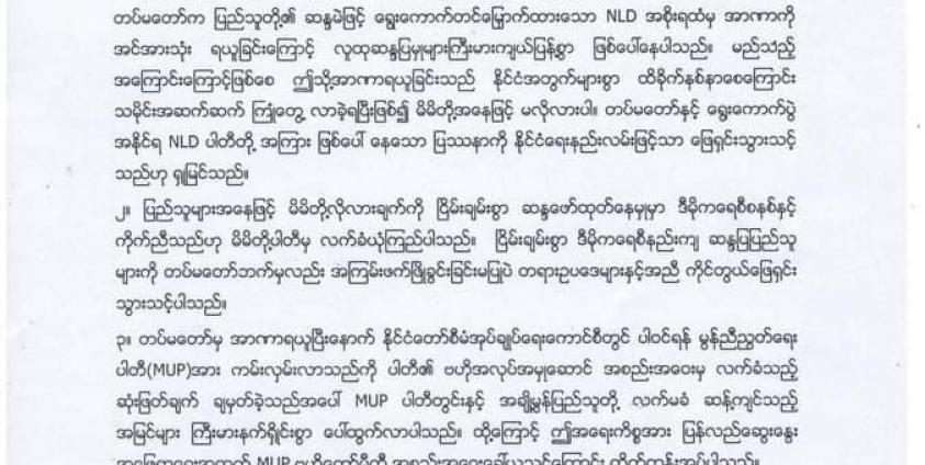 MUP ပါတီတွင်း မွန်အမျိုးသားထုအတွင်း စည်းလုံးညီညွတ်ရေးကို ရည်မှန်းလျက် နိုင်ငံတော်စီမံအုပ်ချုပ်ရေး ကောင်စီတွင် ပါဝင်မည့်အရေးကို MUP မှ ဆွေးနွေးဆုံးဖြတ်ရာတွင် “ပါတီတွင်း ဒီမိုကရေစီနည်းကျကျ အကျေ အလည်ညှိနှိုင်းဆွေးနွေးသုံးသပ်ဆုံးဖြတ်ကြပြီး ထွက်ပေါ်လာသည့်ရလဒ်အား လေးစားလိုက်နာသွားကြရန်” အကြံပြုပါကြောင်း မွန်ပြည်သစ်ပါတီထုတ်ပြန်ချက်တွင် ဖော်ပြသည်။