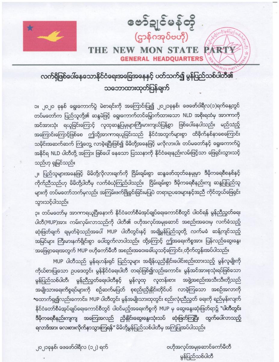 မည်သို့သောအကြောင်းကြောင့်ဖြစ်စေ အာဏာကိုအင်အားသုံးရယူခြင်းဖြင့် နိုင်ငံအတွက်များစွာထိခိုက်နစ်နာစေသည်ကို သမိုင်းအဆက်ဆက်ကြုံတွေ့လာခဲ့ရပြီးဖြစ်၍ မွန်ပြည်သစ်ပါတီအနေဖြင့် မလိုလားကြောင်း၊ တပ်မတော်နှင့် ရွေးကောက်ပွဲအနိုင်ရ NLD ပါတီတို့အကြား ဖြစ်ပေါ်နေသောနေသော ပြဿနာကို နိုင်ငံရေးနည်းလမ်းဖြင့်သာ ဖြေရှင်းသင့်ပါကြောင်း လက်ရှိဖြစ်ပေါ်နေသော နိုင်ငံရေးအခြေအနေနှင့် ပတ်သက်၍ မွန်ပြည်သစ်ပါတီ NMSP ယမန်နေ့ (ဖေဖော်ဝါရီ ၁၂ ) ရက်စွဲဖြင့် သဘောထား ထုတ်ပြန်လိုက်သည်။