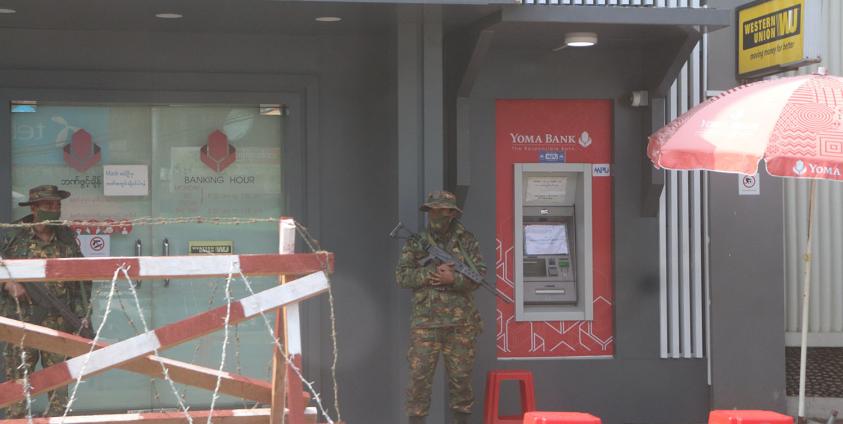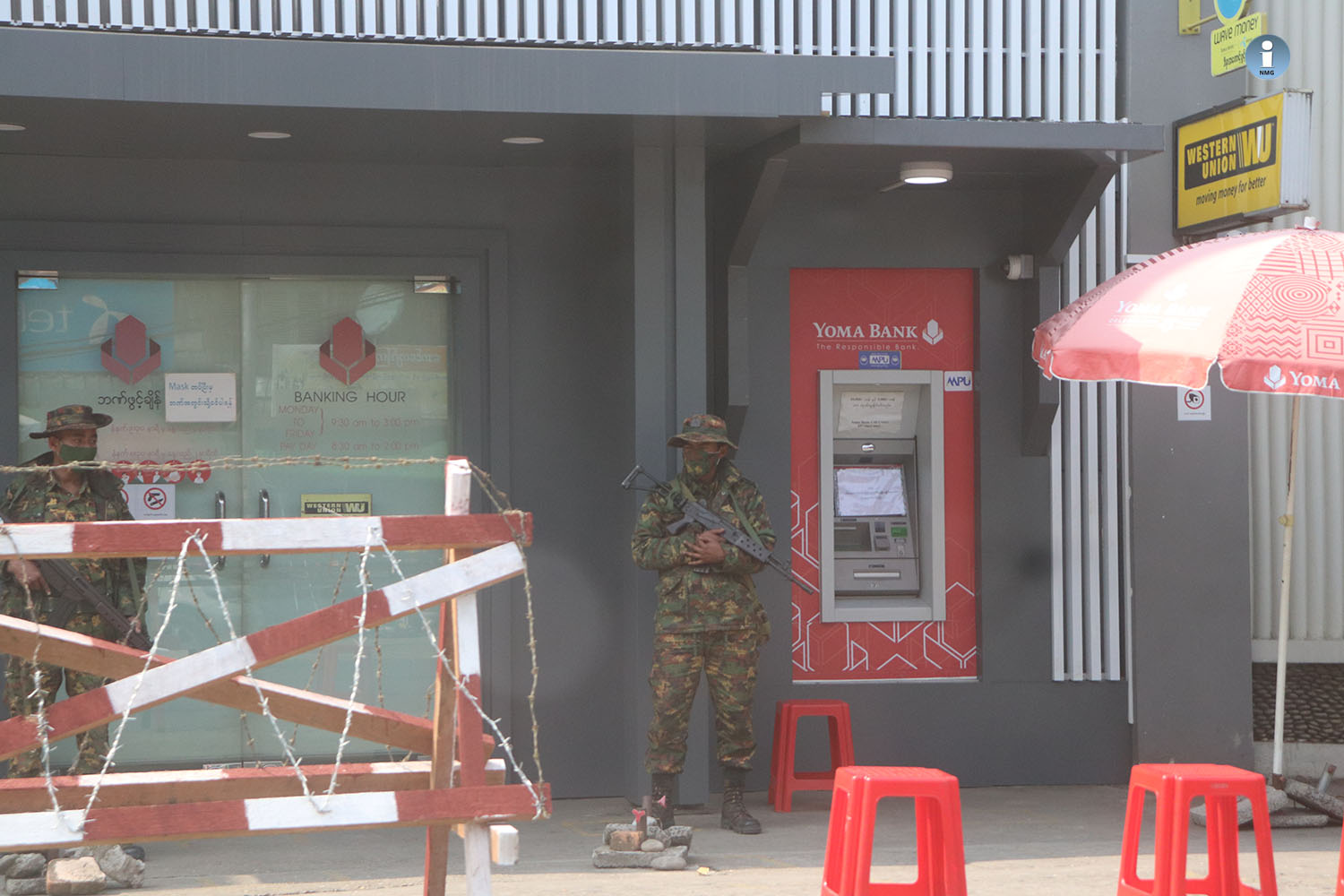 ကချင်ပြည်နယ်၊ မြစ်ကြီးနားမြို့ ရှိ ဘဏ်များရှေ့တွင် ဖေဖော်ဝါရီလ ၁၅ ရက်နေ့ (ယနေ့) တွင် စစ်သားများနှင့် ရဲတပ်ဖွဲ့ဝင်များတင်းကြပ်စွာ နေရာချထားသည်ကို တွေ့ရသည်။