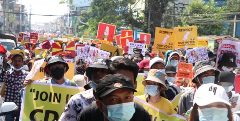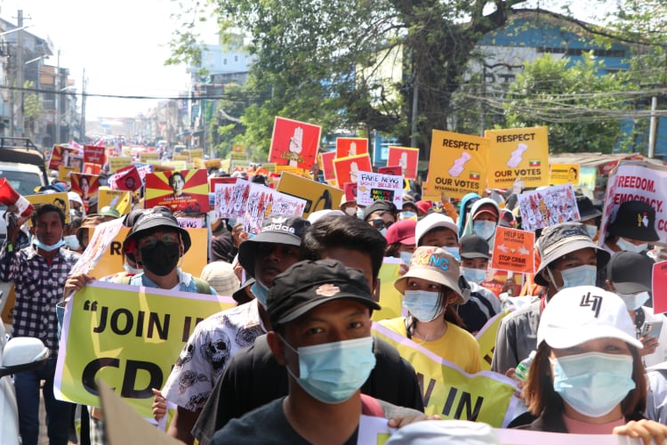 စစ်အာဏာသိမ်းဆန့်ကျင်မှု အာဏာဖီဆန်ရေး “ရုန်းမတက်နဲ့ ရုန်းထွက်”လူထုလှုပ်ရှားမှုတွင် အစိုးရဝန်ထမ်းများ ပါဝင်လာရေး မွန်ပြည်နယ်မြို့တော် မော်လမြိုင်မြို့တွင် (၉) ရက်မြောက်အဖြစ် ယနေ့နံနက်ပိုင်းတွင် သောင်းနှင့်ချီသောလူထုဆန္ဒပြချီတက်ပွဲများ အရှိန်မြင့်လှုပ်ရှားလာသည်။