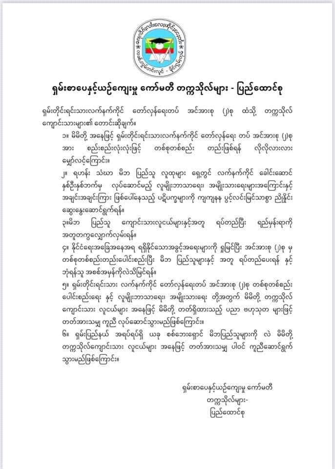 ရှမ်းစာပေနှင့် ယဉ်ကျေးမှု ကော်မတီတက္ကသိုလ် ကျောင်းသားများအနေဖြင့်  ရှမ်းတော်လှန်ရေးတပ်အင်အားစု နှစ်ခု ပူးပေါင်းရန်အပါအဝင် အချက်ခြောက်ချက်ကို တောင်းဆိုသည့်ထုတ်ပြန်ချက်ကို ပြီးခဲ့သည့်် ရက်ပိုင်းက ထုတ်ပြန်လိုက်ခြင်းဖြစ်သည်။