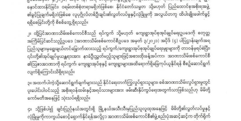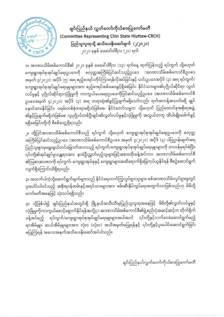 အာဏာသိမ်းစစ်ကောင်စီအဖွဲ့မှ ပြည်သူများရွေးချယ်တင်မြောက်ထားသည့် ရက်ကွက်/ကျေးရွာအုပ်စုအုပ်ချုပ်ရေးမှူးများအား တာဝန်မှရပ်စဲကာ ၎င်းတို့၏ အုပ်ချုပ်မှုယန္တရားအား နာခံဦးညွှတ်မည့်သူများဖြင့် အစားထိုးခန့်အပ်မှုများကို ပြည်သူများအနေဖြင့် လုံးဝအသိအမှတ်မပြုရန်နှင့် ပူးပေါင်းဆောင်ရွက်ခြင်းမပြုကြရန် ချင်းပြည် နယ် လွှတ်တော်ကိုယ်စားပြု ကော်မတီ (CRCH) က ဖေဖော်ဝရီ ၂၁ ရက်က ကြေညာချက်တစ်စောင် ထုတ်ပြန် ကာတောင်းဆိုလိုက်သည်။