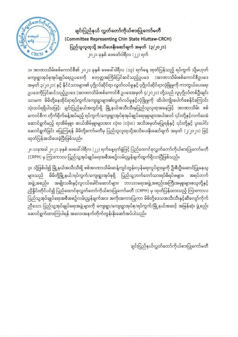 ချင်းပြည်နယ်အတွင်းရှိ မြို့နယ်အသီးသီးမှ ပြည်သူလူထုအနေဖြင့် မိမိတို့၏ လွတ်လပ်မှုနှင့် လုံခြုံမှုကို ကာကွယ်စောင့်ရှောက်နိုင်ရန် အာဏာသိမ်းစစ်ကောင်စီ ဖွဲ့စည်းပုံအဆင့်ဆင့်က တိုက်ရိုက်ခန့်အပ် သော ရပ်ကွက်၊ ကျေးရွာအုပ်စု၊ အုပ်ချုပ်ရေးအမှုးများအပါအဝင် ရာအိမ်မှုး၊ ဆယ်အိမ်မှုးများကို လုံးဝ (လုံးဝ) အသိအမှတ်မပြုရန် နှင့် ၎င်းတို့နှင့် ပူးပေါင်းဆောင်ရွက်ခြင်းမပြုကြရန် CRCH ၏ ဖေဖော်ဝါရီလ ၂၁ ရက်နေ့ ကြေညာချက်တွင် ဖော်ပြထားသည်။