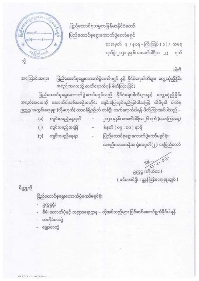 အဆိုပါ အစည်းအဝေးကို ဖေဖော်ဝါရီလ ၂၆ ရက် (သောကြာနေ့) နံနက် ၉ နာရီအချိန်၌ ပြည်ထောင်စုရွေးကောက်ပွဲကော်မရှင်ရုံး၊ အစည်းအဝေးခန်းမ ရုံးအမှတ် (၂)၊ နေပြည်တော်တွင် ကျင်းပပြုလုပ်သွားမည်ဖြစ်ကြောင်း ဖိတ်ကြားစာတွင် ဖော်ပြသည်။