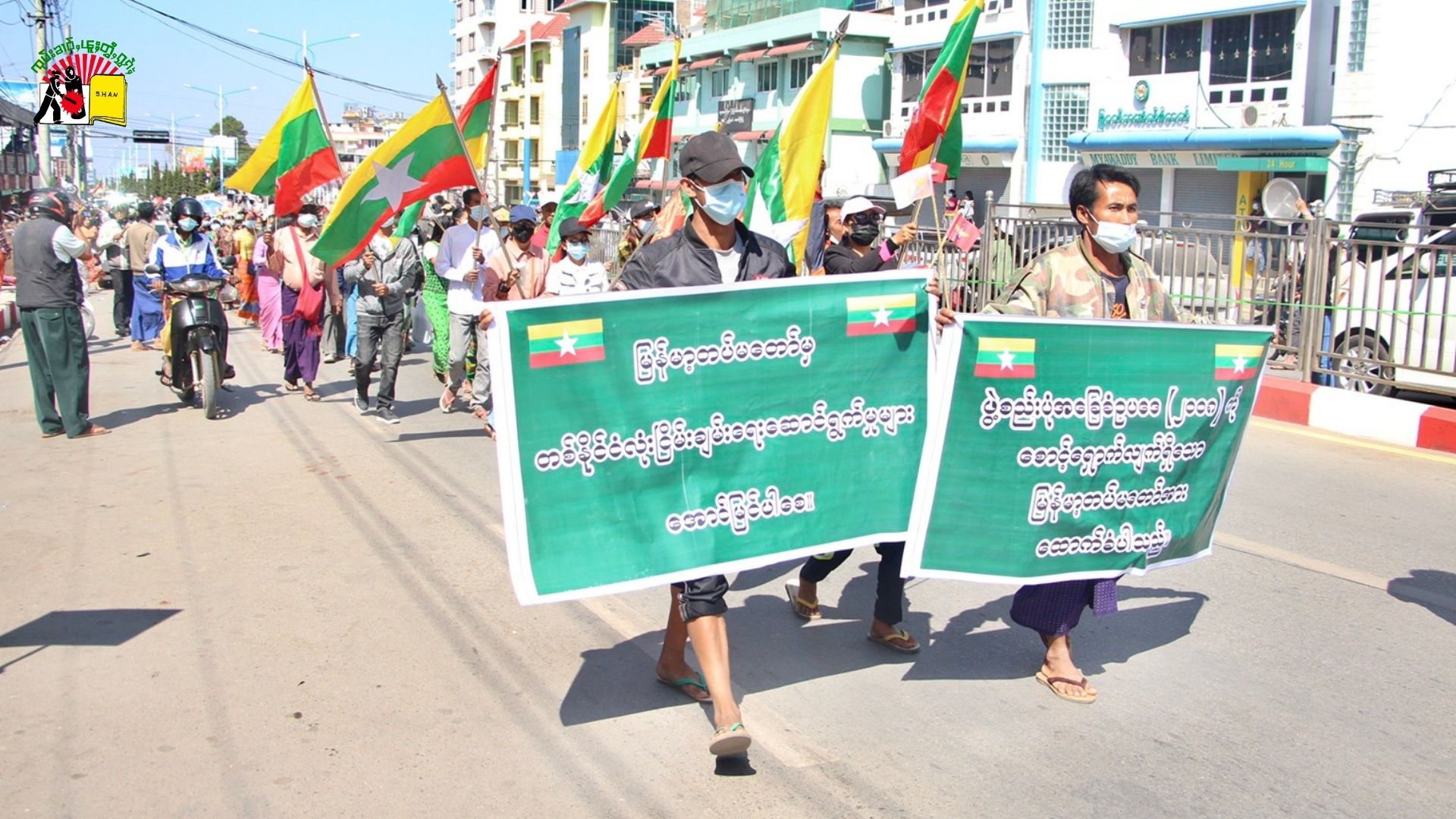 “ နိုင်ငံသားမဟုတ်သူများလွှမ်းမိုးမည့်အကြံ ထောက်မခံ” “ဖွဲ့စည်းပုံ အခြေခံ ဥပဒေ (၂၀၀၈) ကို စောင့်ရှောက်လျက်ရှိသော မြန်မာ့ တပ်မတော် အား ထောက်ခံပါသည်” ဆိုသည့် ဆိုင်းဘုတ်တွေကိုင်ဆောင်ပြီး တောင်ကြီးမြို့တွင် တပ်မတော် ထောက်ခံပွဲ ပြုလုပ်ကြသည်။