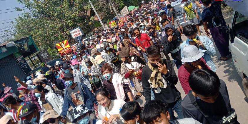 ကရင်ပြည်နယ် မြဝတီမြို့တွင် ယနေ့ (ဖေဖော်ဝါရီ ၂၈ ရက်) နံနက်ပိုင်းက စစ်အာဏာရှင်ဆန့်ကျင်ရေး ဆန္ဒပြပြည်သူများကို ရဲတပ်ဖွဲ့မှ ဖမ်းဆီးဖြိုခွင်းမှုများရှိခဲ့သော်လည်း လူထုအင်အား တစ်သိန်းဝန်းကျင်ဖြင့် ဆက်လက်၍ ဆန္ဒဖော်ထုတ်ခဲ့ကြသည်။