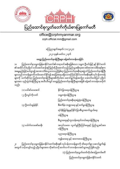 ထို့ပြင် ပြည်ထောင်စုသမ္မတမြန်မာနိုင်ငံတော်အစိုးရ၏ လုပ်ငန်းတာဝန်များကို ထိရောက်စွာ ဆောင်ရွက်ရန်အတွက် သင့်လျော်သည့်ပုဂ္ဂိုလ်များအား လိုအပ်သလို ဆက်လက်တာဝန်ပေးအပ်သွားမည်ဖြစ်သည်ဟု CRPH ၏ ထုတ်ပြန်ချက်ထဲတွင် ထည့်သွင်းထားသည်။