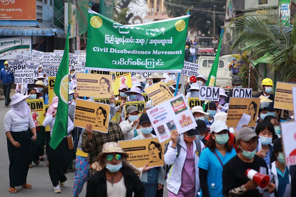 တပ်မတော် အာဏာသိမ်းပြီးနောက် ဖေဖော်ဝါရီလ(၈)ရက်နေ့မှစကာ မြို့နယ်တိုင်းတွင် စစ်အာဏာဆန့်ကျင်ရေး ဆန္ဒထုတ်ဖော်ပွဲများအား လုပ်ဆောင်နေကြပြီး အစိုးရဌာနဆိုင်ရာမှ ဝန်ထမ်းများလည်း CDM ပါဝင်လူပ်ရှားမူတွင် ပိုမိုပါဝင်လာကြကြောင်း သိရသည်။