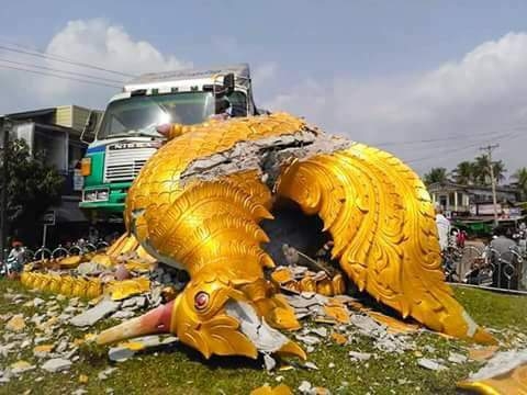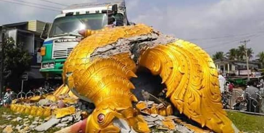 ယာဉ်အမှတ်(1B/2041) Nissan အမျိုးအစား၊ (၁၂)ဘီးတပ်မော်တော်ယာဉ်ပေါ် ဘိလပ်မြေအိပ်များတင်ဆောင်၍ ယာဉ်မောင်း မြင့်ဦး(၃၈)နှစ်၊ ခေါဇာမြို့နေထိုင်သူ မောင်းနှင်လာစဉ် အရှိန်မထိန်းနိုင်ဘဲ လူတစ်ရပ်ခန့်မြင့်သည့် မြို့လယ်အဝိုင်းအုတ်ခုံကိုကျော်တက်ကာ ဝင်ရောက်တိုက်မိသဖြင့် ရွှေဟင်္သာရုပ်တုလုံးဝပျက်စီးသွားသည်ဟု ဆိုသည်။