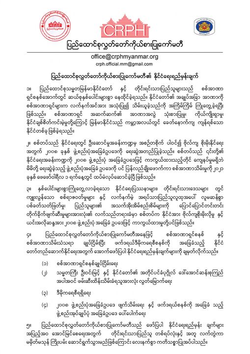 ထို့အပြင် အဆိုပါ နိုင်ငံရေးရည်မှန်း ချက်များ အပြည့်အဝ အောင်မြင်စေရေးအတွက် တိုင်းရင်းသားပြည်သူ တစ်ရပ်လုံးနှင့် အတူ လက်တွဲကာ မမှိတ်မသုန် ကြိုးပမ်း ဆောင်ရွက်သွားမည်ဖြစ်ကြောင်း လေးနက်စွာ ကတိသစ္စာပြုအပ်ပါသည်ဟု CRPH က ပြောသည်။