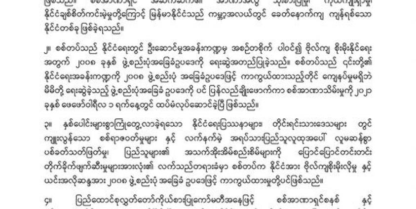 ထို့အပြင် စစ်တပ်သည် နိုင်ငံရေးတွင် ဦးဆောင်မှုအခန်းကဏ္ဍမှ အစဉ်တစိုက်ပါဝင်၍ ဗိုလ်ကျစိုးမိုးနိုင်ရေးအတွက် ၂၀၀၈ ခုနှစ် ဖွဲ့စည်းပုံအခြေခံဥပဒေကို ရေးဆွဲအတည်ပြုခဲ့ကြောင်းနှင့် ၎င်းတို့၏ နိုင်ငံရေးအခန်းကဏ္ဍကို ၂၀၀၈ ဖွဲ့စည်းပုံအခြေခံဥပဒေဖြင့် ကာကွယ်ထားသည့်တိုင် ကျေနပ်မှုမရှိဘဲ မိမိတို့ ရေးဆွဲခဲ့သည့် ဖွဲ့စည်းပုံအခြေခံဥပဒေကိုပင် ပြန်လည်ချိုးဖောက်ကာ စစ်အာဏာသိမ်းမှုကို ၂၀၂၁ ခုနှစ် ဖေဖော်ဝါရီလ ၁ ရက်နေ့တွင် ထပ်မံလုပ်ဆောင်ခဲ့ပြီဖြစ်သည်ဟု CRPH ၏ နိုင်ငံရေးရည်မှန်းချက် ထုတ်ပြန်ချက်ထဲတွင် ပါရှိသည်။