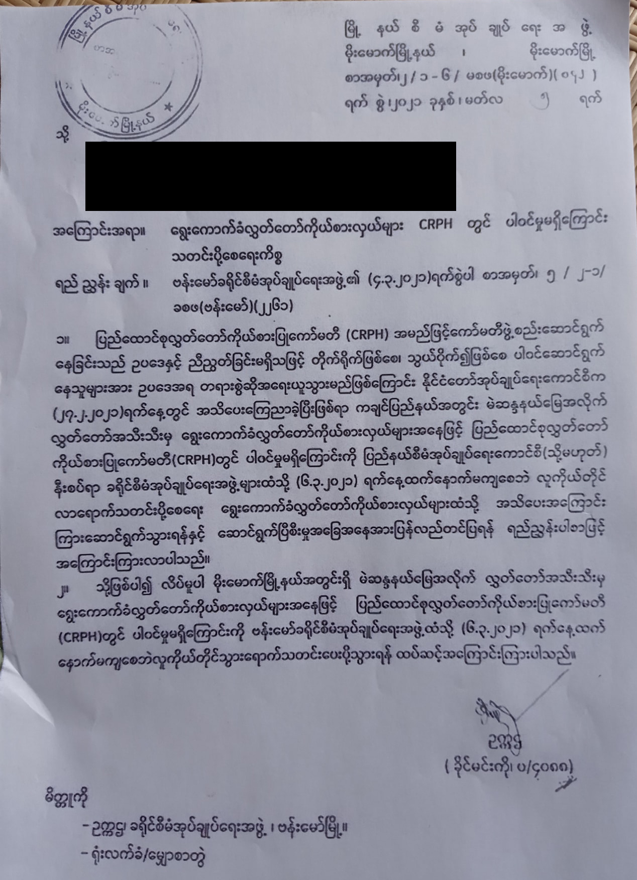 CRPH တွင် မပါဝင်ရန်နှင့် ပါဝင်ခြင်းမရှိကြောင်းကို ခရိုင်အုပ်ချုပ်ရေးအဖွဲ့ထံသို မတ် ၆ ရက်မတိုင်ခင် လူကိုယ်တိုင် လာရောက်သတင်းပို့ရန်ဟူသောစာကို လက်ခံရရှိထားကြောင်း ဗန်းမော်မြို့နယ် ၂၀၂၀ ခုနှစ် ရွေးကောက်ပွဲ၀င်ရောက်ယှဉ်ပြိုင်ခဲ့သည့် လွှတ်တော်ကိုယ်စားလှယ်လောင်းတစ်ဦးက ပြောသည်။