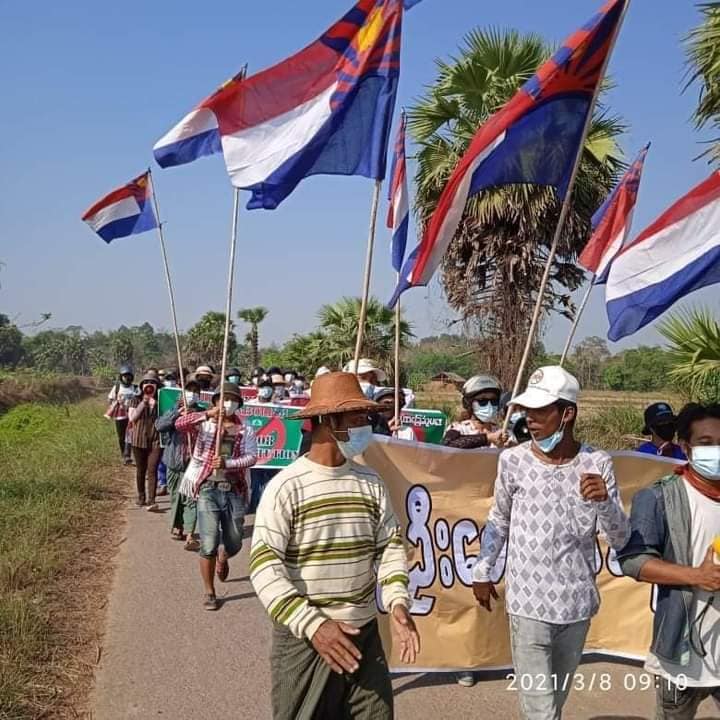 ဧရာဝတီ ကရင်လူငယ် အထွေထွေသပိတ်စစ်ကြောင်းသည် မတ် ၈ ရက်နေ့တွင် အိမ်မဲမြို့နှင့် ပန်းတနော်မြို့နယ်တို့တွင် အာဏာရှင်စနစ် ဖျက်သိမ်းရေး၊ ၂၀၀၈ ဖွဲ့စည်းပုံ အခြေခံဥပဒေဖျက်သိမ်းရေး၊ ဖက်ဒရယ်ဒီမိုကရေစီပြည်ထောင်စုပေါ်ပေါက်ရေးနှင့် မတရားဖမ်းဆီးခံရသူများ လွတ်မြောက်ရေး စသည့် ကြွေးကြော်သံများကြွေးကြော်ကာ ချီတက်ဆန္ဒပြခဲ့ကြသည်။