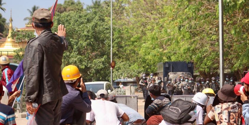 ယနေ့နံနက် ၉ နာရီခွဲအချိန်ခန့်က “စစ်အာဏာရှင် အလိုမရှိ၊ ဒီမိုကရေစီရရှိရေး ဒို့အရေး- သမ္မတ ဦးဝင်းမြင့်နှင့် အမေစုတို့အား အမြန်ဆုံး လွှတ်ပေးရေး ဒို့အရေး၊ ပြည်သူတွေ တင်မြှောက်ထားသော အစိုးရ ဒို့အစိုးရ၊ ပြည်ထောင်စုလွှတ်တော် ခေါ်ယူပေးရေး ဒို့အရေး၊ ဒီမိုကရေစီရရှိရေး ဒို့အရေး၊ အရေးတော်ပုံ အောင်ရမည်၊ သပိတ် သပိတ် မှောက်မှောက်၊ ရုံးမတက်နဲ့ ရုန်းထွက်” စသည့် ကြွေးကြော်သံများဖြင့် ကမ်းနားလမ်းမှစတင်၍ မြို့ပေါ်လမ်းမကြီးတလျှောက် ချီတက်ဆန္ဒပြခဲ့ကြောင်း ရေးမြို့ခံများမှ သိရသည်။