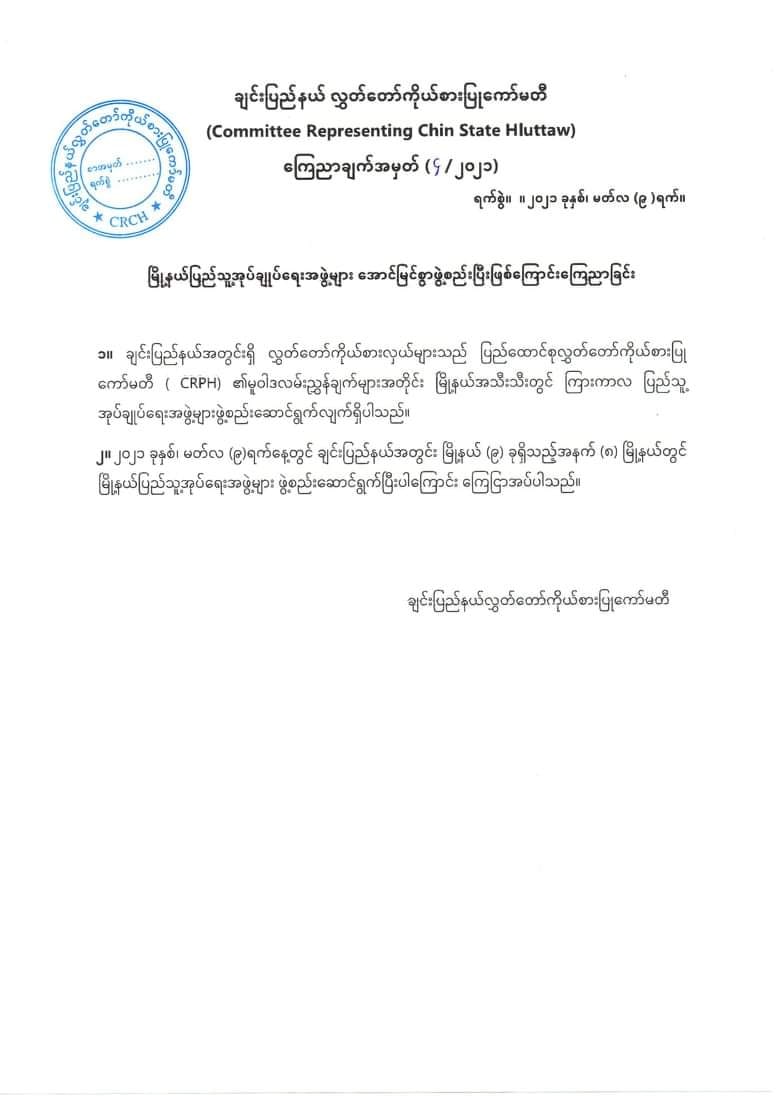 ချင်းပြည်နယ်အတွင်း မြို့နယ်ကိုးခုရှိသည့်အနက် မြို့နယ်ရှစ်ခုတွင် မြို့နယ် ပြည်သူ့အုပ်ချုပ်ရေးအဖွဲ့များ ဖွဲ့စည်းဆောင်ရွက်ပြီးစီးကြောင်း ချင်းပြည်နယ်၊ လွတ်တော်ကိုယ်စားပြုကော်မတီ (CRCH) က မတ် ၉ ရက်က ထုတ်ပြန်ကြေညာခဲ့သည်။