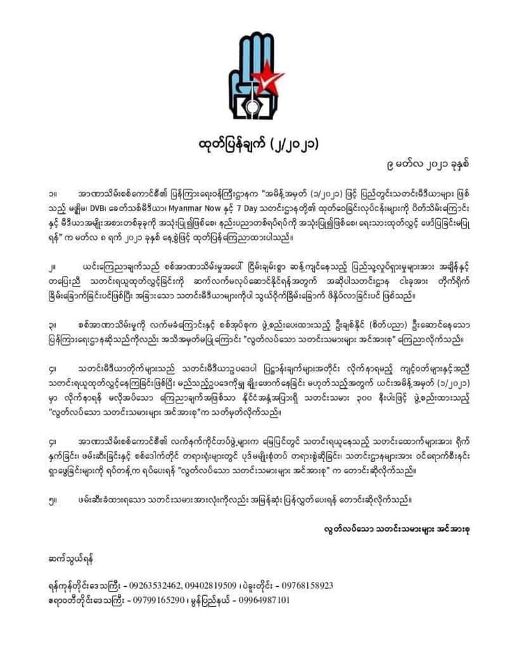 နိုင်ငံတော်စီမံအုပ်ချုပ်ရေးကောင်စီမှ မြန်မာပြည်တွင်းရှိ မီဒီယာ (၅) ခု၏ ထုတ်ဝေခြင်းလုပ်ငန်းများကို ပိတ်ပင်ကြောင်း ကြေညာထားသော်လည်း အဆိုပါကောင်စီအား အသိအမှတ်မပြုသည့်အတွက် မီဒီယာများနှင့် သတင်းသမားများအနေဖြင့် ကိုယ့်အလုပ်ကို လုပ်ကြဖို့ လွတ်လပ်သော သတင်းသမားများအင်အားစုက တိုက်တွန်းလိုက်သည်။