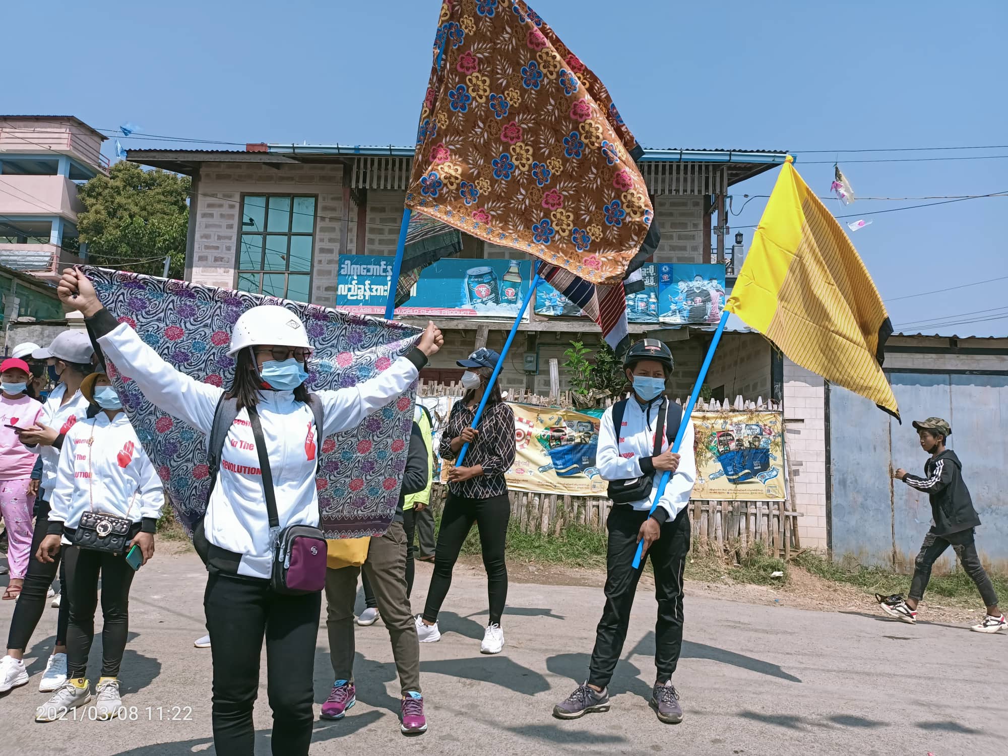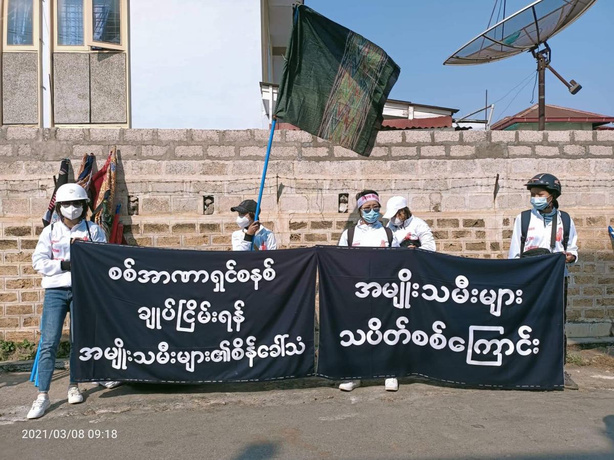 နိုင်ငံတကာ အမျိုးသမီးများနေ့ အနေဖြင့် ထဘီ အလံလွှင့်ပြီး အနောက်မြို့ပတ်လမ်း ကို အမျိုးသမီး အင်အား ၂၀၀ ကျော် သည် ပြည်တော်သာရပ်ကွက် တွင် လူစုစည်းခဲ့ချိန် ဖြိုခွင်းခံရကြောင်း သိရသည်။