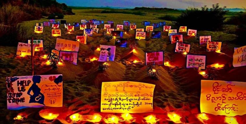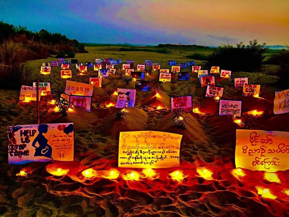 ‘ကျွန်ုပ်တို့ ဝိညာဥ်များသည် စစ်အာဏာရှင်စနစ်ကို လုံးဝအလိုမရှိပါ။ အရေးတော်ပုံအောင်ရမည်၊ ၂၀၀၈ ဖွဲ့စည်းပုံ ဥပဒေအလိုမရှိ၊ We Support KIO/KIA ၊ We Need R2P၊ We Want KNU စသည့် စာသားများကိုသဲပြင်ပေါ်တွင် စိုက်ထူကာ ဆန္ဒပြတောင်းဆိုခဲ့ကြသည်။