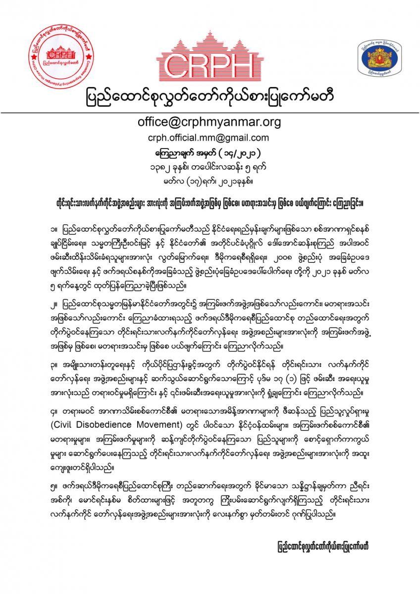 ထို့အပြင် ကိုယ်ပိုင်ပြဌာန်းခွင့်အတွက် တိုက်ပွဲဝင်နေသည့် တိုင်းရင်းသား လက်နက်ကိုင် အဖွဲ့အစည်းများကို မတရားအသင်း ၁၇/၁ ဖြင့် ဖမ်းဆီးအရေးယူမှုကို ရှုတ်ချကြောင်း CRPH က ဆိုသည်။