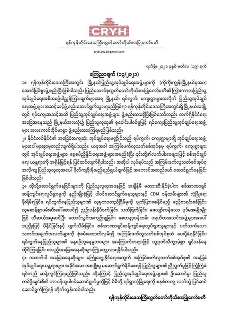 မြို့နယ်ပြည်သူ့အုပ်ချုပ်ရေးအဖွဲ့ ဖွဲ့စည်းပြီးကြောင်း ရန်ကုန်တိုင်း CRYH ကြေညာ