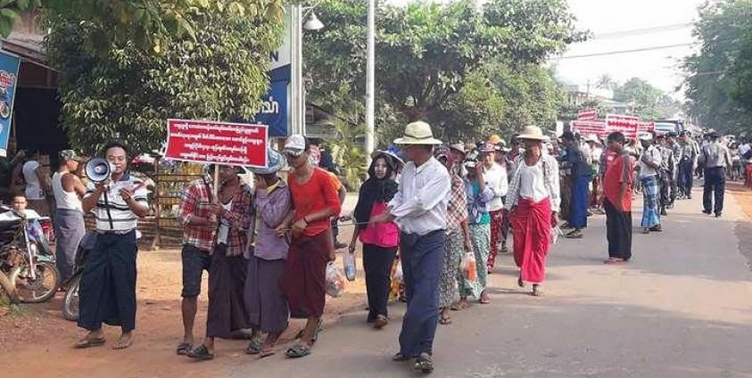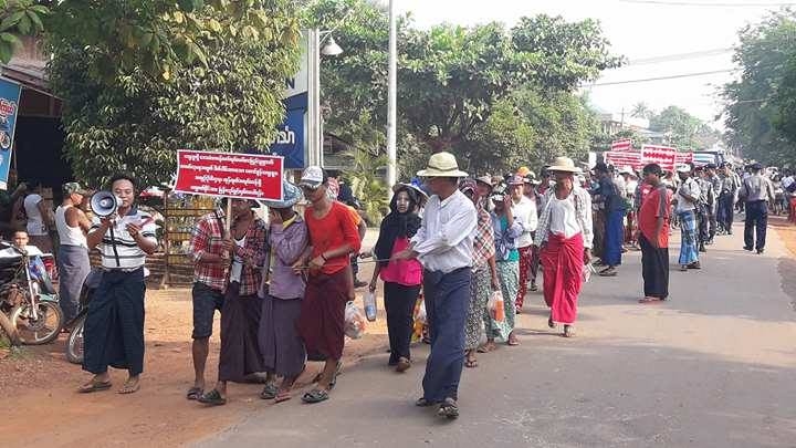 ဆန္ဒထုတ်ဖော်သူများသည် "ကျောက်ထုတ်အလုပ်စခန်းကျောက်မိုင်းများကို ပြန်လည်ဖွင့်လှစ်ပေးရေး ဒို့အရေး"၊ "ဆင်းရဲနွမ်းပါးသော ဒေသခံ ကျေးလက်နေပြည်သူများ အလုပ်အကိုင် ရရှိရေး ဒို့အရေး"၊ "ဆင်းရဲနွမ်းပါးသော ဒေသခံ ကျေးလက်ပြည်သူများ၏ ဘဝကို အမှန်တကယ်တွေ့မြင်ပေးရေး ဒို့အရေး"၊ "အလုပ်အကိုင် အခွင့်အလမ်း ပြန်လည်ရရှိရေး ဒို့အရေး"၊ "ဒေသခံပြည်သူတွေရဲ့အသံ နားထောင်ရေး ဒို့အရေး"၊ "လွှတ်တော်သည် ပြည်သူအတွက် ဖြစ်စေရေး ဒို့အရေး" စသည့် ကြွေးကြော်သံများ၊ ဆိုင်းဘုတ်များ ကိုင်ဆောင်ကာ ချီတက်ခဲ့ကြသည်။