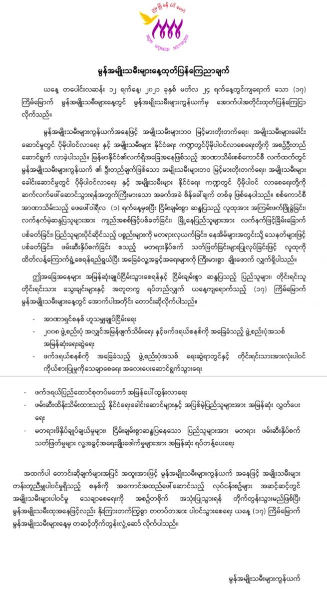 အလားတူ မွန်အမျိုးသမီးများကွန်ရက်အနေဖြင့် အမျိုးသမီးများတန်းတူညီမျှပါဝင်မှုရှိသည့်စနစ်ကို အကောင်အထည်ဖော်မည့် လုပ်ငန်းစဉ်အဆင့်ဆင့်တွင် အမျိုးသမီးများပါဝင်မှုသေချာစေရေးကို အစဉ်တစိုက်တိုက်တွန်းသွားမည်ဖြစ်ပြီး မွန်အမျိုးသမီးထုအနေဖြင့်လည်း နိုးကြားတက်ကြွစွာ တတပ်တအားပါဝင်သွားစေရေး ယနေ့တွင် ကျရောက်သော (၁၇) ကြိမ်မြောက် မွန်အမျိုးသမီးများနေ့မှတဆင့် တိုက်တွန်းနှိုးဆော်လိုက်ပါကြောင်း ကြေညာချက်တစ်ရပ် ထုတ်ပြန်ထားသည်။