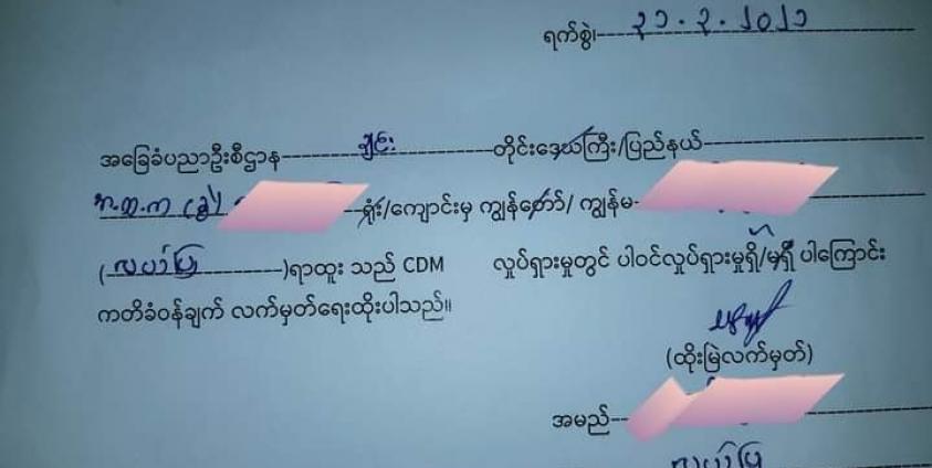 CDM တွင်မပါဝင်ကြောင်း ခံဝန်ကတိထိုးမှ လစာထုတ်ပေးမည်ဟု မတူပီမြို့နယ် ပညာရေးဝန်ထမ်းများ ခြိမ်းခြေက်ခံရ