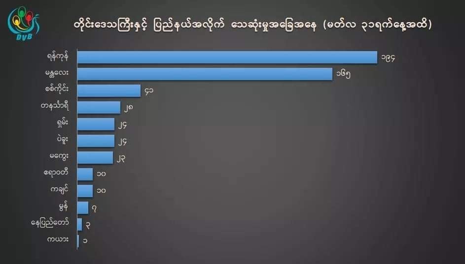 သတင်းမီဒီယာများ၏ ဖော်ပြမှုအရ မတ် ၃၁ ရက်အထိ ရန်ကုန်တိုင်း ၁၉၄ ဦး၊ မန္တလေးတိုင်း ၁၆၅ ဦး၊ စစ်ကိုင်းတိုင်း ၄၁ ဦး၊ တနင်္သာရီတိုင်း ၂၈ ဦး၊ ပဲခူးတိုင်း ၂၄ ဦး၊ ရှမ်းပြည်နယ် ၂၄ ဦး၊ မကွေးတိုင်း ၂၃ ဦး၊ ဧရာဝတီတိုင်း ၁၀ ဦး၊ ကချင်ပြည်နယ် ၁၀ဦး၊ နေပြည်တော် ၃ ဦးနှင့် ကယားပြည်နယ် ၁ ဦး အသီးသီးကျဆုံးခဲ့သော်လည်း ရခိုင်ပြည်နယ်အတွင်း အကျအဆုံးဖြစ်ပေါ်ခဲ့ခြင်းမရှိပေ။