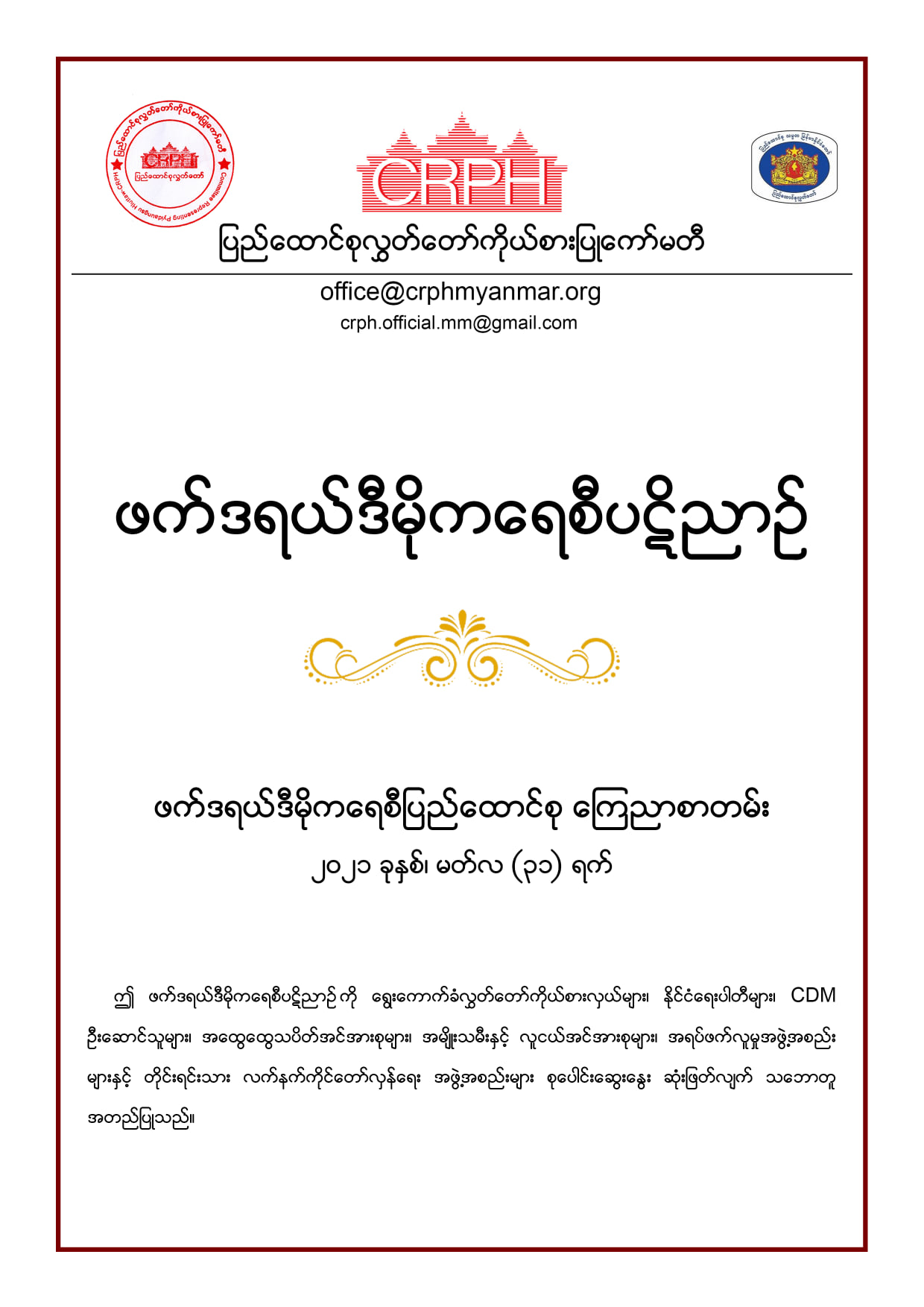 ပြီးခဲသည့် မတ် ၃၁ ရက်က CRPH မှ ၂၀၀၈ ဖွဲ့စည်းပုံ အခြေခံဥပဒေကို အပြီးသတ်ဖျက်သိမ်းကြောင်း ကြေညာခဲ့သည့်အပြင် ဖက်ဒရယ် ဒီမိုကရေစီ ပဋိညာဉ်ကြောညာစာတမ်းကိုပါ ထုတ်ပြန်ခဲ့သည်။