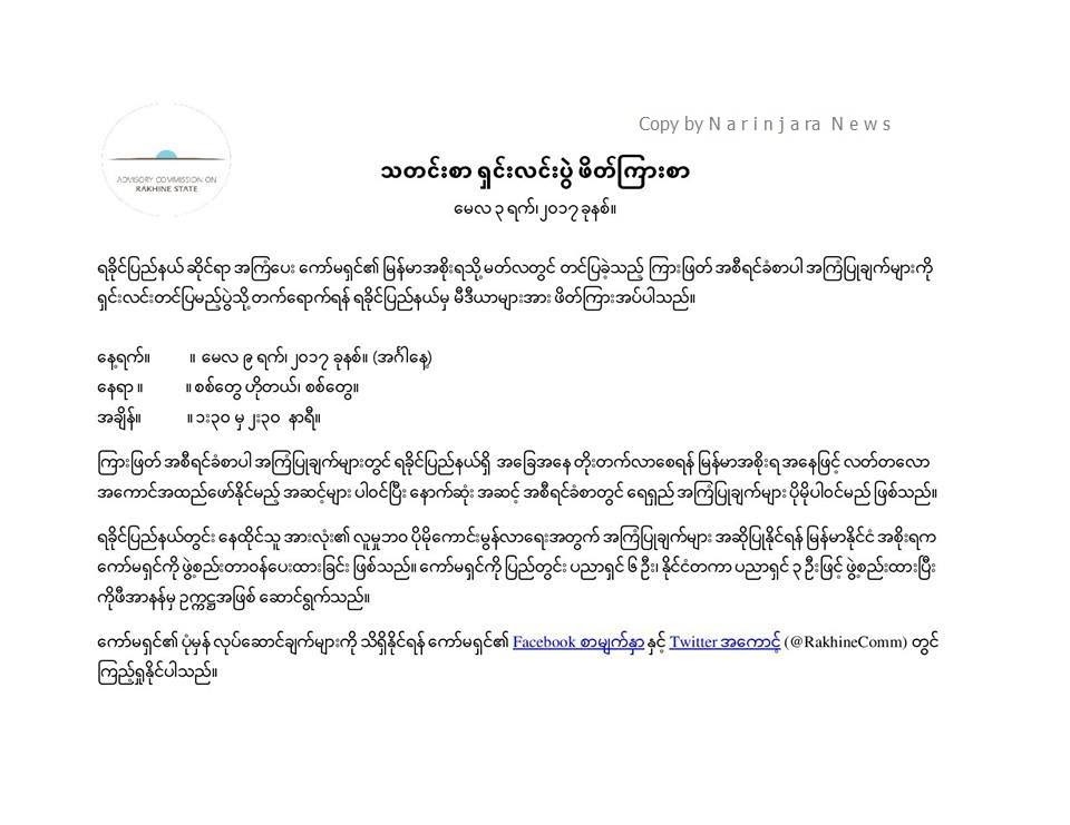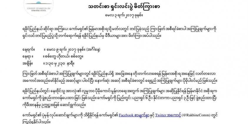 ရခိုင်ပြည်နယ်ဆိုင်ရာ အကြံပေး ကော်မရှင် စစ်တွေတွင် သတင်းစာရှင်းလင်းပွဲ ပြုလုပ်မည်