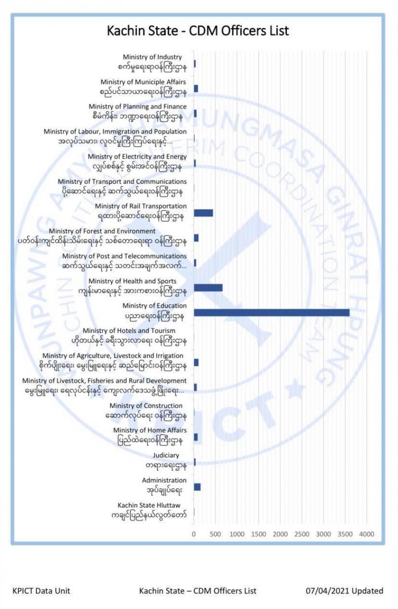 CDM လှုပ်ရှားမှုတွင် ကချင်ပြည်နယ်အတွင်း လူဦးရေအရ အများဆုံးပါဝင်သည့် အစိုးရဝန်ကြီးဌာနမှာ ပညာရေးဝန်ကြီးဌာနဖြစ်ပြီး တစ်ပြည်နယ်လုံးတွင် ဌာနပေါင်းစုံက CDM ဝန်ထမ်း ၅၅၃၂ ဦး ပါဝင်သည်။