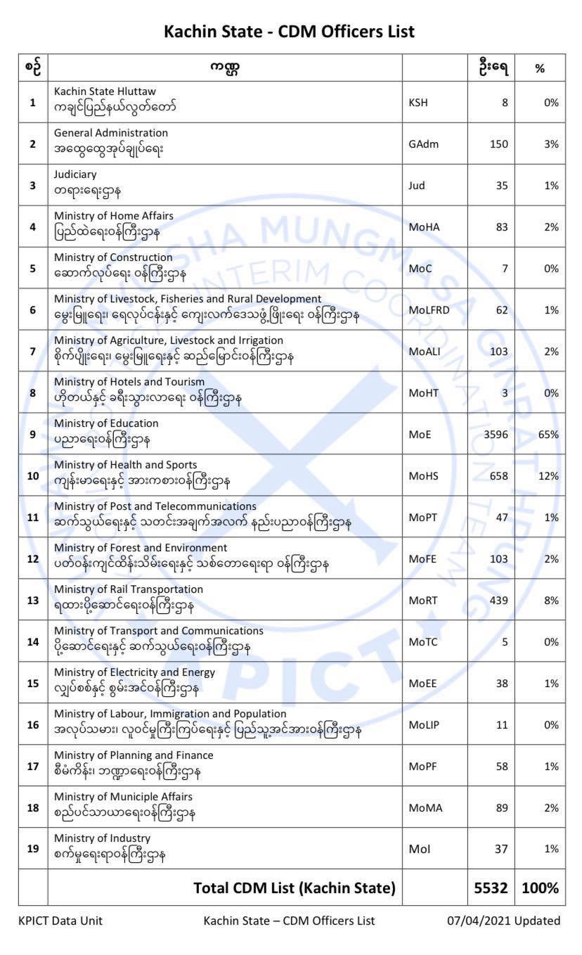 “KPICT မှ သက်ဆိုင်ရာ CRPH အဖွဲ့ဝင်များနှင့် ပူးပေါင်းကောက်ခံစုစည်းထားသော လက်ရှိစစ်တမ်းအရ ကချင်ပြည်နယ်တွင် CDM ဝန်ထမ်းဦးရေ စုစုပေါင်း ၅၅၃၂ ဦးရှိကြောင်း သိရှိရပါသည်” ဟု ထုတ်ပြန်ထားသည်။