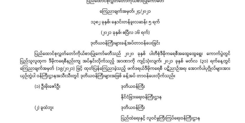 ကယန်းအမျိုးသားပါတီ (KNP) ဥက္ကဌ ခွန်းဘီထူးကို သံယဇာတနှင့် သဘာဝပတ်ဝန်းကျင်ထိန်းသိမ်းရေးဝန်ကြီးဌာန ဒုတိယဝန်ကြီး၊ ကရင်နီ အမျိုးသားတိုးတက်ရေးပါတီ KNPP မှ အမြဲတမ်းဗဟိုကော်မတီဝင် ခူးထဲဘူးကို ပြည်ထဲရေးနှင့်လူဝင်မှုကြီးကြပ်ရေးဝန်ကြီးဌာန ဒုတိယဝန်ကြီး၊ ကရင်နီပြည် လူမျိုးပေါင်းစုံ ပြည်သူ့လွတ်မြောက်ရေးတပ်ဦး က.လ.လ.တ မှ အတွင်းရေးမှုး ဦးချစ်ထွန်းကို ဖက်ဒရယ်ပြည်ထောင်စုရေးရာ ဝန်ကြီးဌာန ဒုတိယဝန်ကြီးအဖြစ် အသီးသီးခန့်အပ်ထားသည်။