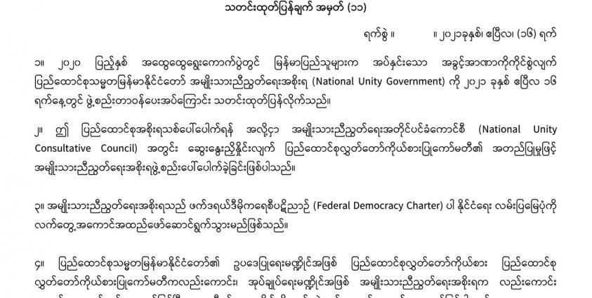 CRPH အနေဖြင့် ၂၀၂၀ ခုနှစ် ပါတီစုံဒီမိုကရေစီ အထွေထွေရွေးကောက်ပွဲတွင် ပြည်သူလူထုက ဒီမိုကရေစီနည်းကျ အပ်နှင်းလိုက်သည့် အာဏာကိုကျင့်သုံးလျက် ၂၀၂၁ ခုနှစ် မတ်လ ၃၁ ရက်နေ့က ထုတ်ပြန်ကြေညာခဲ့သည့် ဖက်ဒရယ်ဒီမိုကရေစီပဋိညာဉ်အရ အမျိုးသားညီညွှတ်ရေး အစိုးရကို ဖွဲ့စည်းခဲ့ခြင်းဖြစ်သည်ဟု ဆိုသည်။