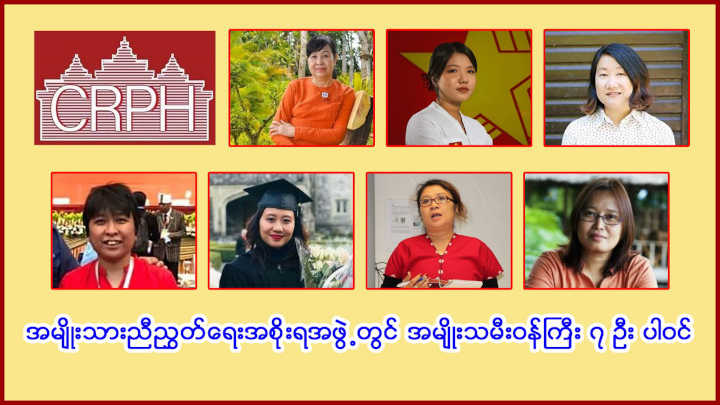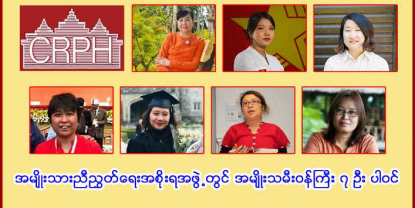 ပြည်ထောင်စုလွှတ်တော်ကိုယ်စား ပြုကော်မတီ(CRPH)က ဖွဲ့စည်းလိုက်သည့် အမျိုးသားညီညွှတ်ရေးအစိုးရ အဖွဲ့တွင် အမျိုးသမီးဝန်ကြီး ၇ဦးပါဝင်ကြောင်း ယနေ့ ဧပြီလ ၁၆ရက် နေ့စွဲဖြင့် ထုတ်ပြန်သော ကြေညာချက် အမှတ် ၂၃/၂၀၂၁ အရ သိရသည်။