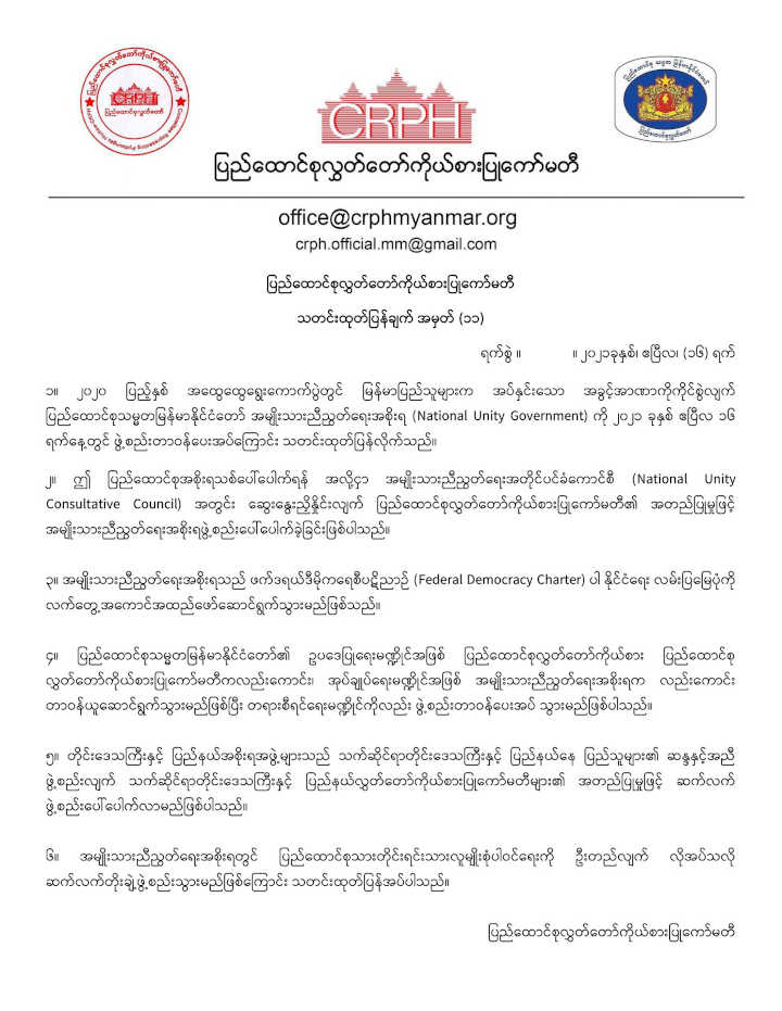 CRPH အနေဖြင့် ၂၀၂၀ ခုနှစ် ပါတီစုံ ဒီမိုကရေစီ အထွေထွေ ရွေးကောက်ပွဲတွင် ပြည်သူလူထုက ဒီမိုကရေစီ နည်း ကျ အပ်နှင်းလိုက်သည့် အာဏာကို ကျင့်သုံးလျက် ၂၀၂၁ ခုနှစ် မတ်လ ၃၁ ရက်နေ့က ထုတ်ပြန်ကြေညာခဲ့သည့် ဖက်ဒရယ် ဒီမိုကရေစီ ပဋိညာဉ်အရ အမျိုးသား ညီညွှတ်ရေး အစိုးရကို ဖွဲ့စည်းခဲ့ခြင်းဖြစ်သည် ဟု ဆိုသည်။