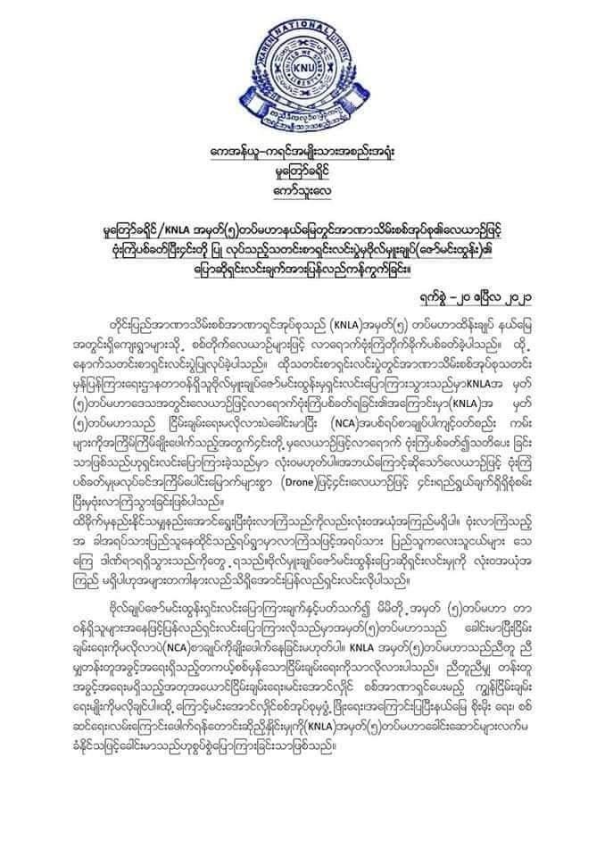 ကရင်အမျိုးသားအစည်းအရုံးဘက်က NCA အပစ်ရပ်စာချုပ်ချိုးဖောက်ကြောင်း ဗိုလ်မှူးချုပ်ဇော်မင်းထွန်း၏ပြောဆိုမှုအပေါ် ကန့်ကွက်ကြောင်း မူတြော်ခရိုင် KNLA အမှတ် (၅) တပ်မဟာ က ယနေ့ (ဧပြီလ ၂၀ ရက်) ထုတ်ပြန်လိုက်သည်။