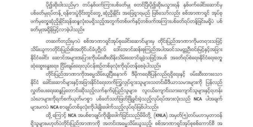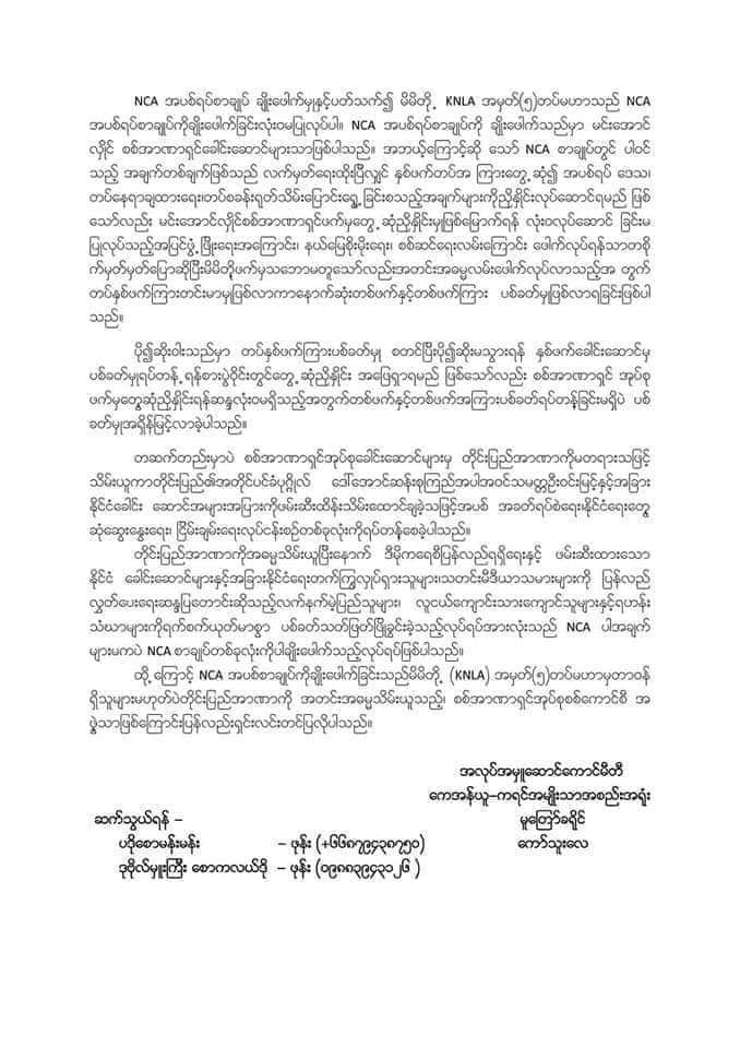 အကြမ်းဖက်စစ်ကောင်စီက ဒီမိုကရေစီပြန်လည်ရရှိရေးနှင့် ဖမ်းဆီးခံထားရသည့် နိုင်ငံခေါင်းဆောင်များအပြင် နိုင်ငံရေးတက်ကြွလှုပ်ရှားသူများ၊ လူငယ်ကျောင်းသား/ကျောင်းသူများနှင့် ရဟန်းသံဃာများကို ရက်စက်စွာ ပစ်ခက်ခြင်းသည် NCA ပါအချက်အပြင် စာချုပ်တစ်ခုလုံးကို ချိုးဖောက်ခြင်းဖြစ်ကြောင်း ထုတ်ပြန်ချက်တွင် ဖော်ပြထားသည်။