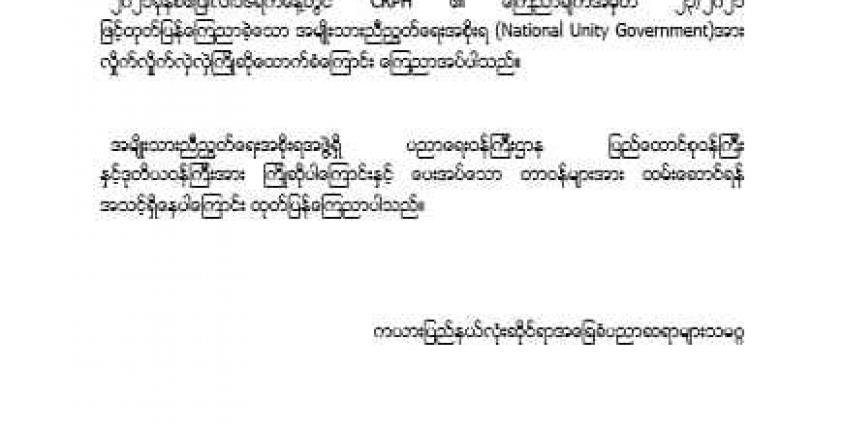 NUG ကို CRPH ကဧပြီလ ၁၆ရက်နေ့မှာ ဖွဲ့စည်းခဲ့တာဖြစ်ပြီး လူထုထောက်ခံမှုရရှိထားတဲ့ အဖွဲ့ဖြစ်ပါတယ်။ ကယားပြည်နယ်မှာ ဖွဲ့စည်းထားတဲ့ ကရင်နီပြည်နယ်အတိုင်ပင်ခံကောင်စီ ( KSCC ) ရဲ့ လမ်းညွှန်မှုကိုလည်း လိုက်နာသွားမယ်လို့ ဆိုပါတယ်။