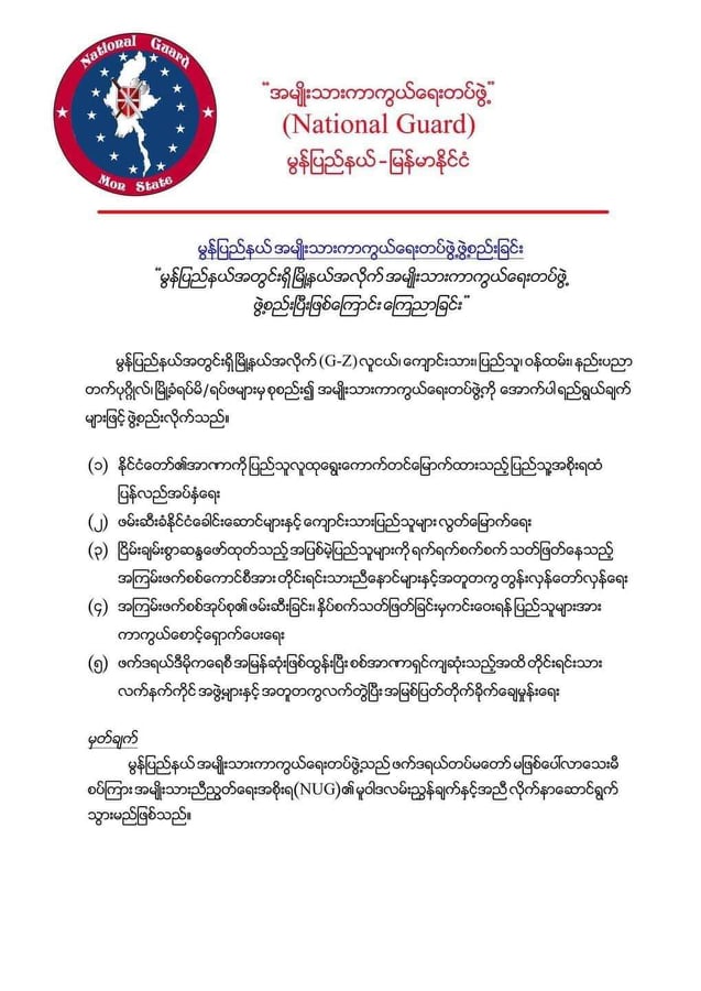 မွန်ပြည်နယ်အတွင်းရှိ မြို့နယ်အလိုက် အမျိုးသားကာကွယ်ရေးတပ်ဖွဲ့ (National Guard) ကို ရည်ရွက်ချက် ၅ ချက်ဖြင့် ဧပြီလ ၂၂ ရက်နေ့တွင် ဖွဲ့စည်းလိုက်ကြောင်း ကြေညာချက် ထုတ်ပြန်လိုက်သည်။
