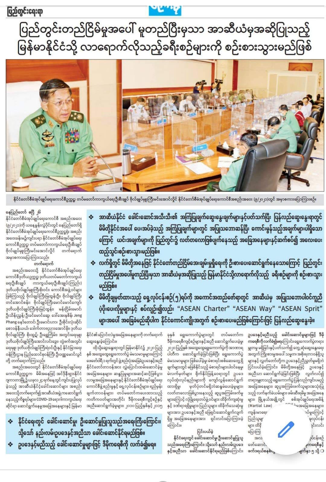 ဧပြီ ၂၆ ရက် (ယမန်နေ့) က ပြုလုပ်သည့် စစ်ကောင်စီအဖွဲ့၏ အစည်းအဝေးအမှာစကားထဲတွင် ထိုသို့ ထည့်သွင်းပြောကြားခဲ့ကြောင်း ၎င်းတို့၏အာဘော် သတင်းစာစောင်တစ်စောင်ဖြစ်သည့် ကြေးမုံသတင်းစာက ဖော်ပြထားသည်။