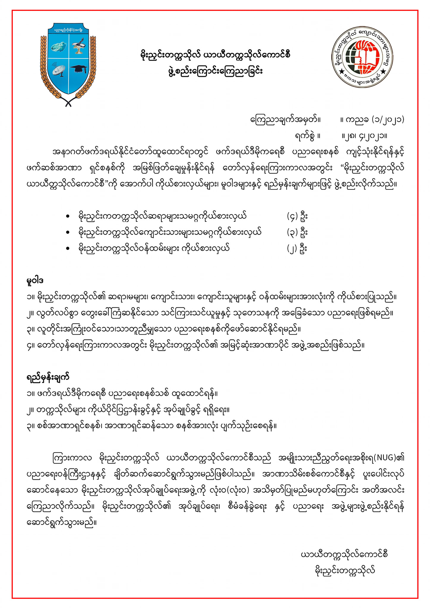 မိုးညှင်းတက္ကသိုလ် ယာယီတက္ကသိုလ်ကောင်စီဖွဲ့စည်းကြောင်း ကြေညာ၊ ဖယ်ဒရယ်ဒီမိုကရေစီပညာရေးစနစ် ကျင့်သုံးနိုင်ရန် လုပ်ဆောင်မည်ဟုဆို