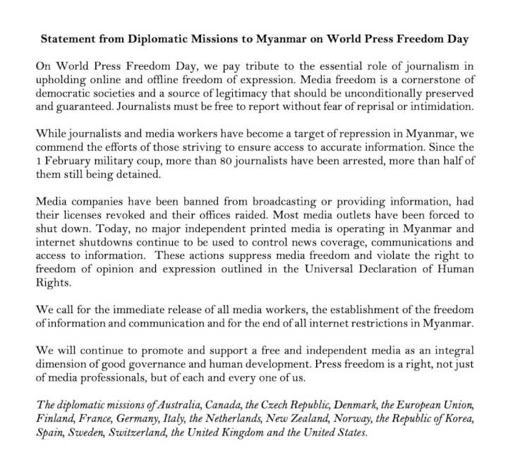 မေလ ၃ ရက်နေ့တွင်ကျရောက်သည့် ကမ္ဘာ့စာနယ်ဇင်းလွတ်လပ်ခွင့်နေ့နှင့်ပတ်သက်ပြီး ဩစတေးလျ၊ ကနေဒါ၊ ချက်သမ္မတနိုင်ငံ၊ ဒိန်းမတ်၊ ဥရောပသမဂ္ဂ၊ ဖင်လန်၊ ပြင်သစ်၊ ဂျာမနီ၊ အီတလီ၊ နယ်သာလန်၊ နယူးဇီလန်၊ နော်ဝေး၊ ကိုရီးယားသမ္မတနိုင်ငံ၊ စပိန်၊ ဆွီဒင်၊ ဆွဇ်ဇာလန်၊ ယူကေနဲ့ အမေရိကန်ပြည်ထောင်စုဆိုင်ရာ သံတမန်အဖွဲ့အစည်းများက ယခုကဲ့သို့ တောင်းဆိုလိုက်ခြင်းဖြစ်သည်။