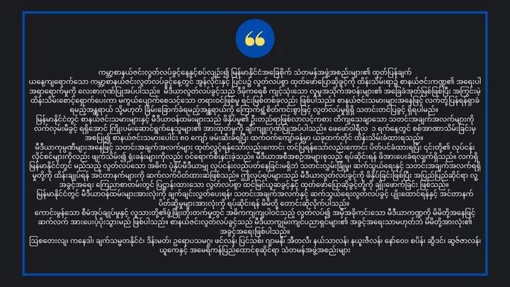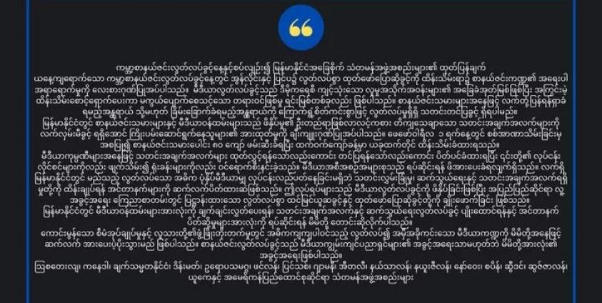 ၎င်းအပြင် မီဒီယာအစီအစဉ်အများစုသည် ရပ်ဆိုင်းရန် ဖိအားပေးခံရလျက်ရှိပြီး လက်ရှိ မြန်မာနိုင်ငံတွင် မည်သည့် လွတ်လပ်သောပုံနှိပ်မီဒီယာမျှ လုပ်ငန်းလည်ပတ်နေခြင်းမရှိဘဲ သတင်းလွှမ်းခြုံမှု၊ ဆက်သွယ်ရေးနှင့် သတင်းအချက်အလက်ရရှိမှုတို့ကို ထိန်းချုပ်ရန် အင်တာနက်များကို ဆက်လက်ပိတ်ထားဆဲဖြစ်သည်။