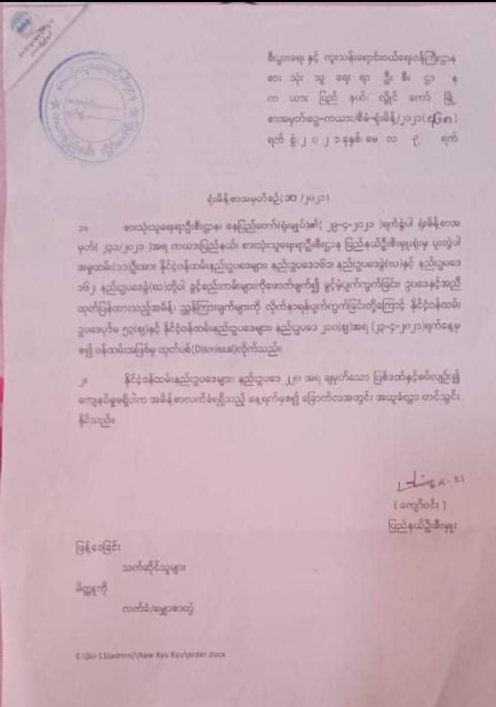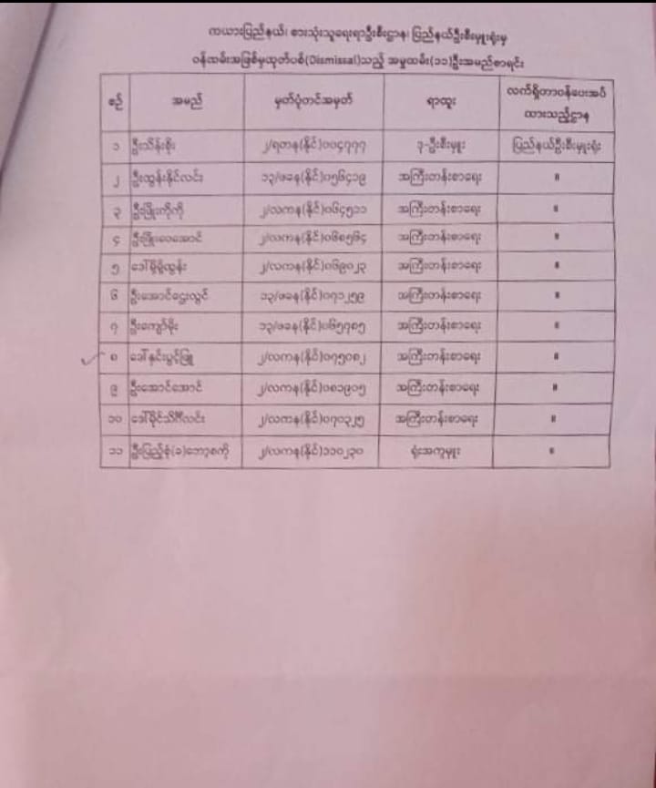 ကယားပြည်နယ် စားသုံးသူရေးရာဦးစီးဌာနမှ CDM လုပ်သည့်ဝန်ထမ်း (၁၁) ဦးကို ပြီးခဲ့သည့် ဧပြီလ ၂၄ ရက်မှစပြီး အလုပ်မှထုတ်ပယ် (Dismissal) လိုက်ကြောင်း မေလ (၃) ရက်နေ့တွင် အကြောင်းကြားစာပေးပို့လာသည်ဟု သိရသည်။