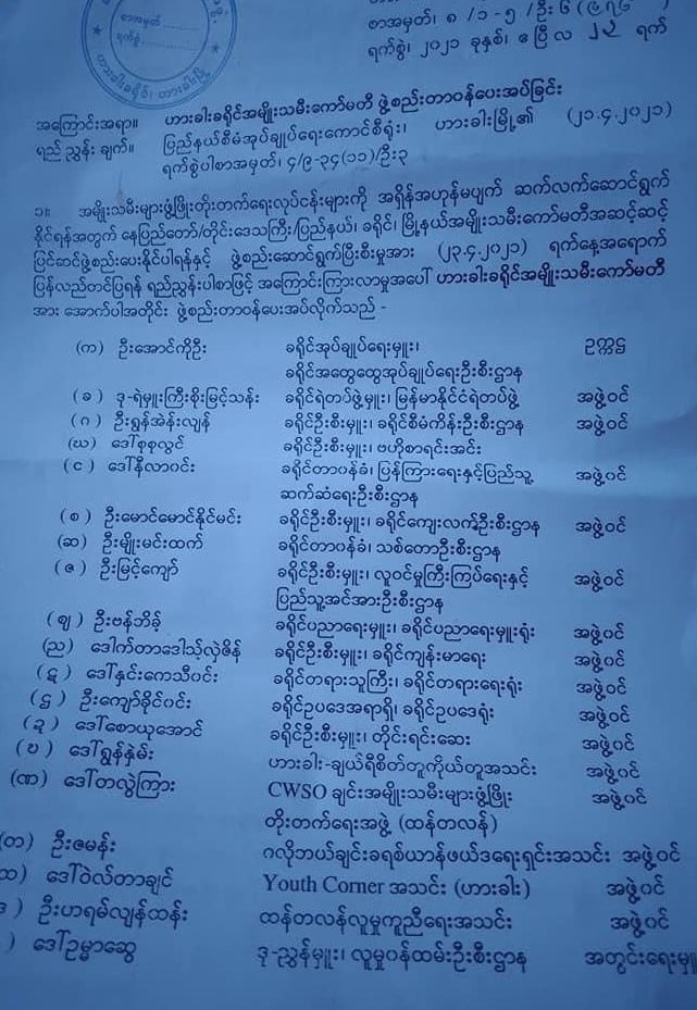ဟားခါး ခရိုင်စီမံအုပ်ချုပ်ရေးဥက္ကဌမှ ဧပြီလ ၂၃ ရက်နေ့ ရက်စွဲဖြင့် အမျိုးသမီးများ ဖွံ့ဖြိုးတိုးတက်ရေးလုပ်ငန်းများကို အရှိန်အဟုန်မပျက် ဆက်လက်ဆောင်ရွက်နိုင်ရန်အတွက် ဟားခါး ခရိုင်အမျိုးသမီးကော်မတီ ဖွဲ့စည်းတာဝန်ပေးအပ်လိုက်ကြောင်း အဖွဲ့ဝင်များထံသို့ မေလ ၄ ရက်နေ့တွင် စာရောက်ရှိလာကြောင်း သိရသည်။