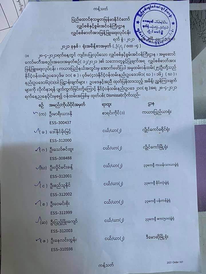 စစ်ကောင်စီကနေပြီးတော့ နိုင်ငံ့ဝန်ထမ်းနည်းဥပဒေ ၂၁၀ (ဈ) အရဆိုပြီး ဧပြီလ ၂၈ ရက်နေ့တွင် အလုပ်ကနေ ထုတ်ပယ်လိုက်ခြင်းဖြစ်ကြောင်း ပါရှိပါသည်။